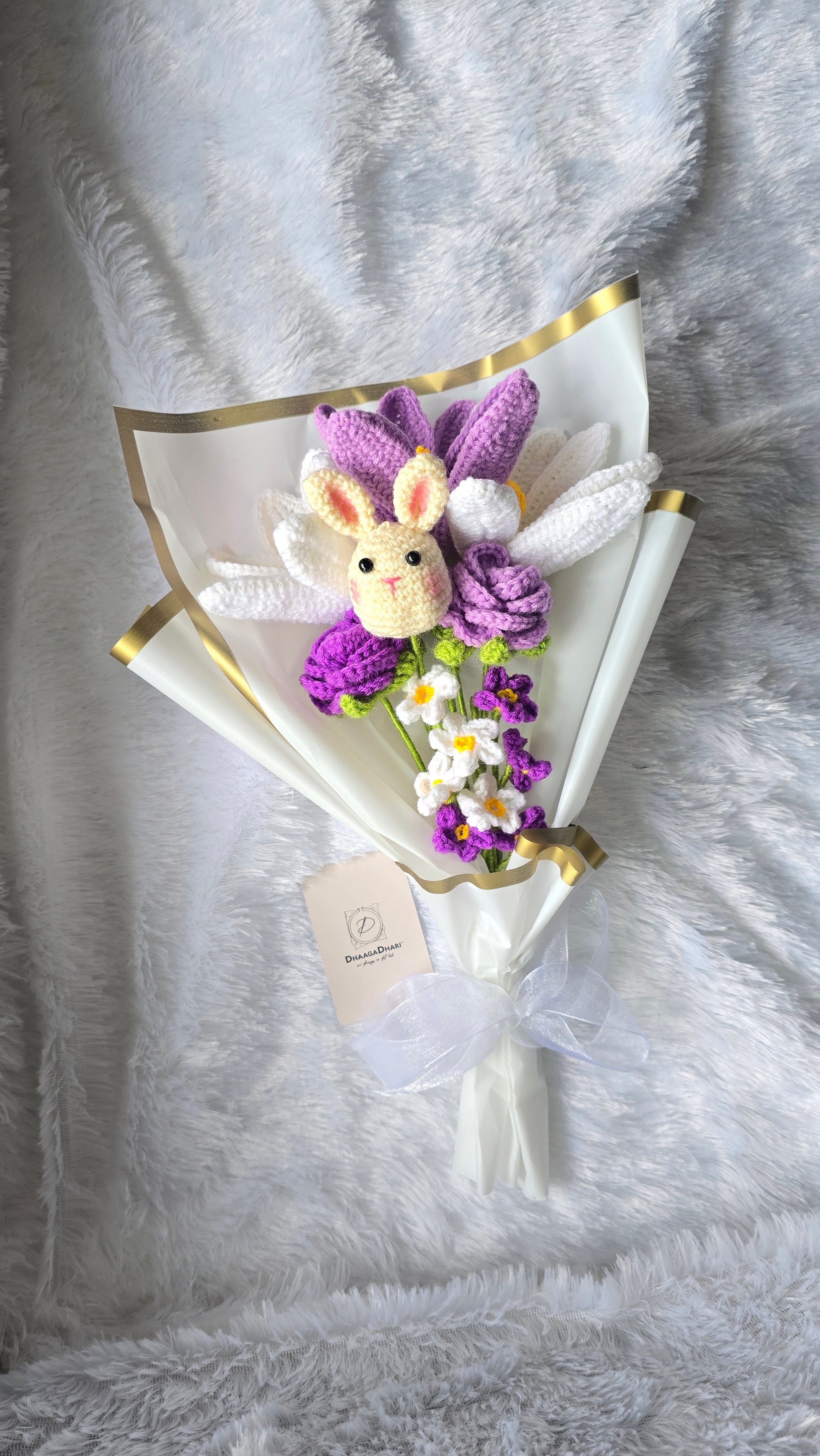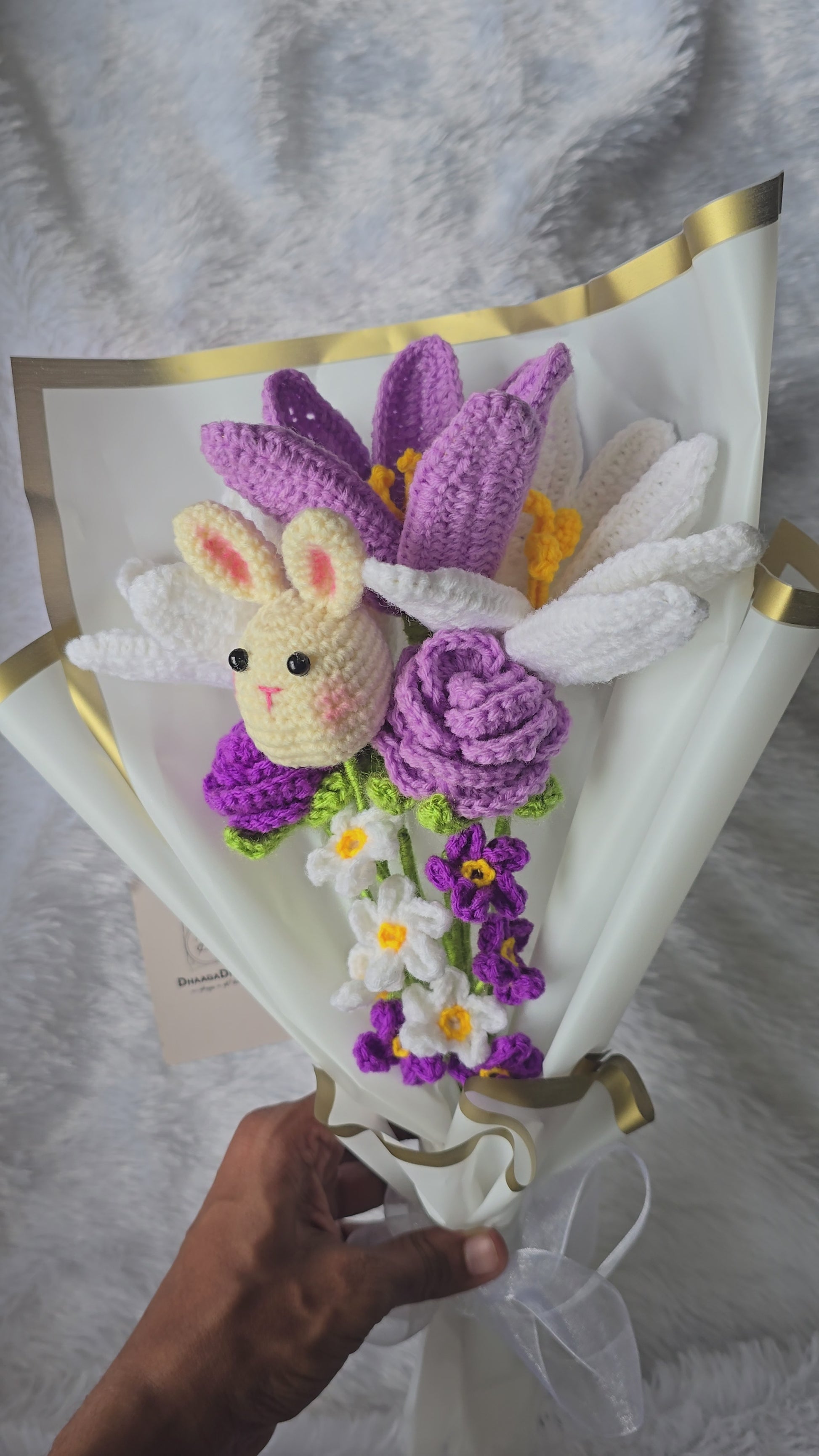 Bunny Blossom Crochet Bouquet – Lilies, Roses & Forget-Me-Nots
