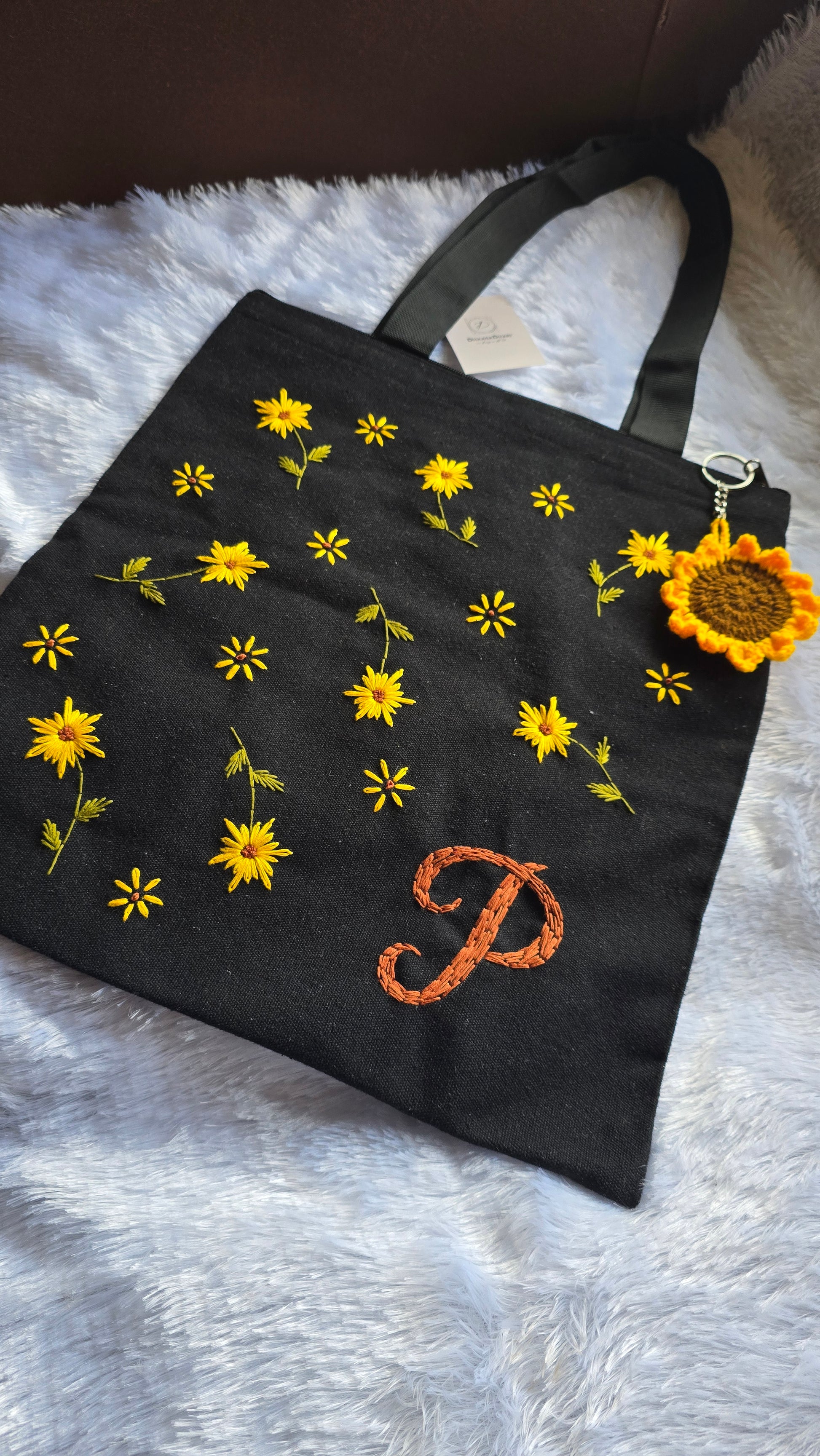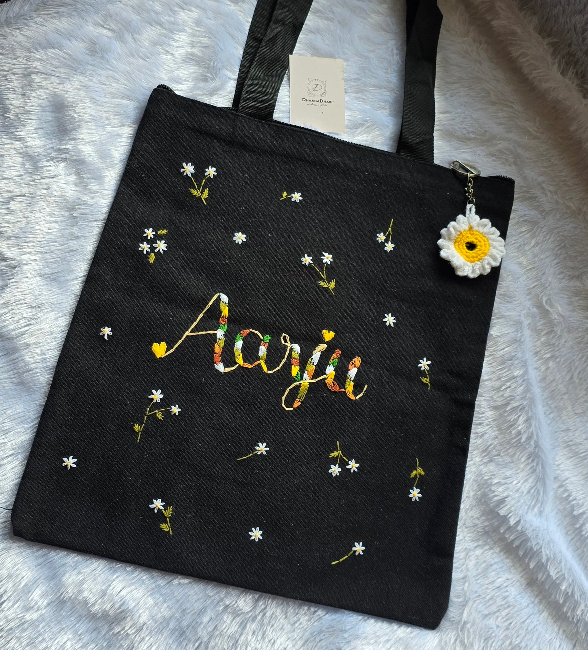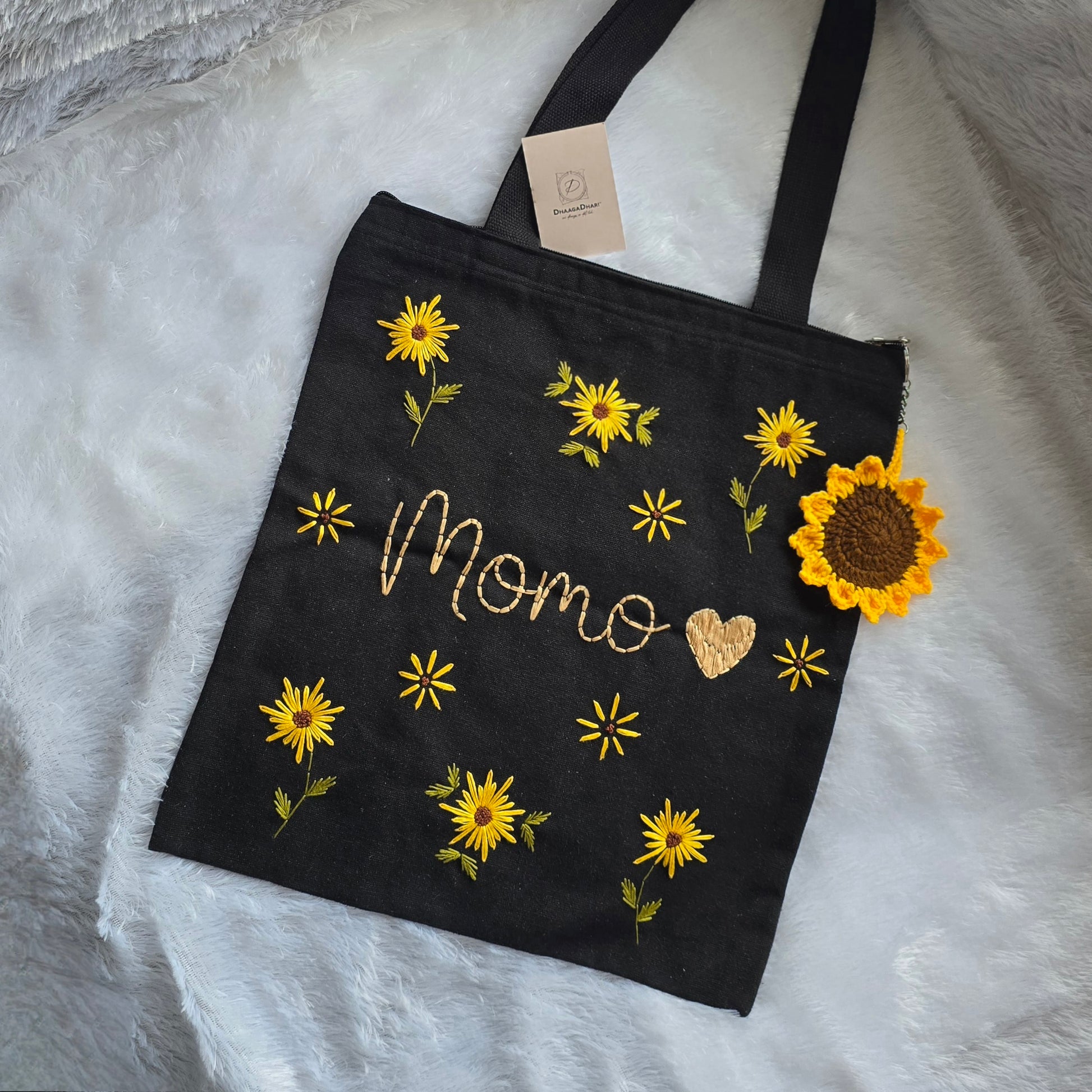 Customized Embroidered Tote Bag | Black & Off-White color with zip | Sunflower | Sunflower Charm