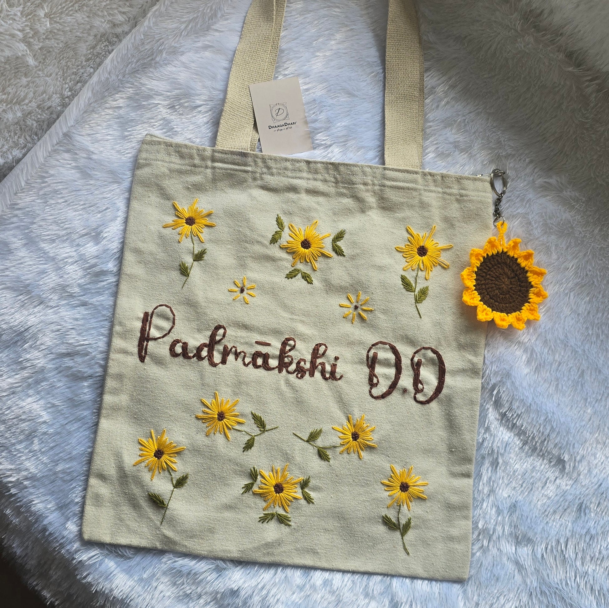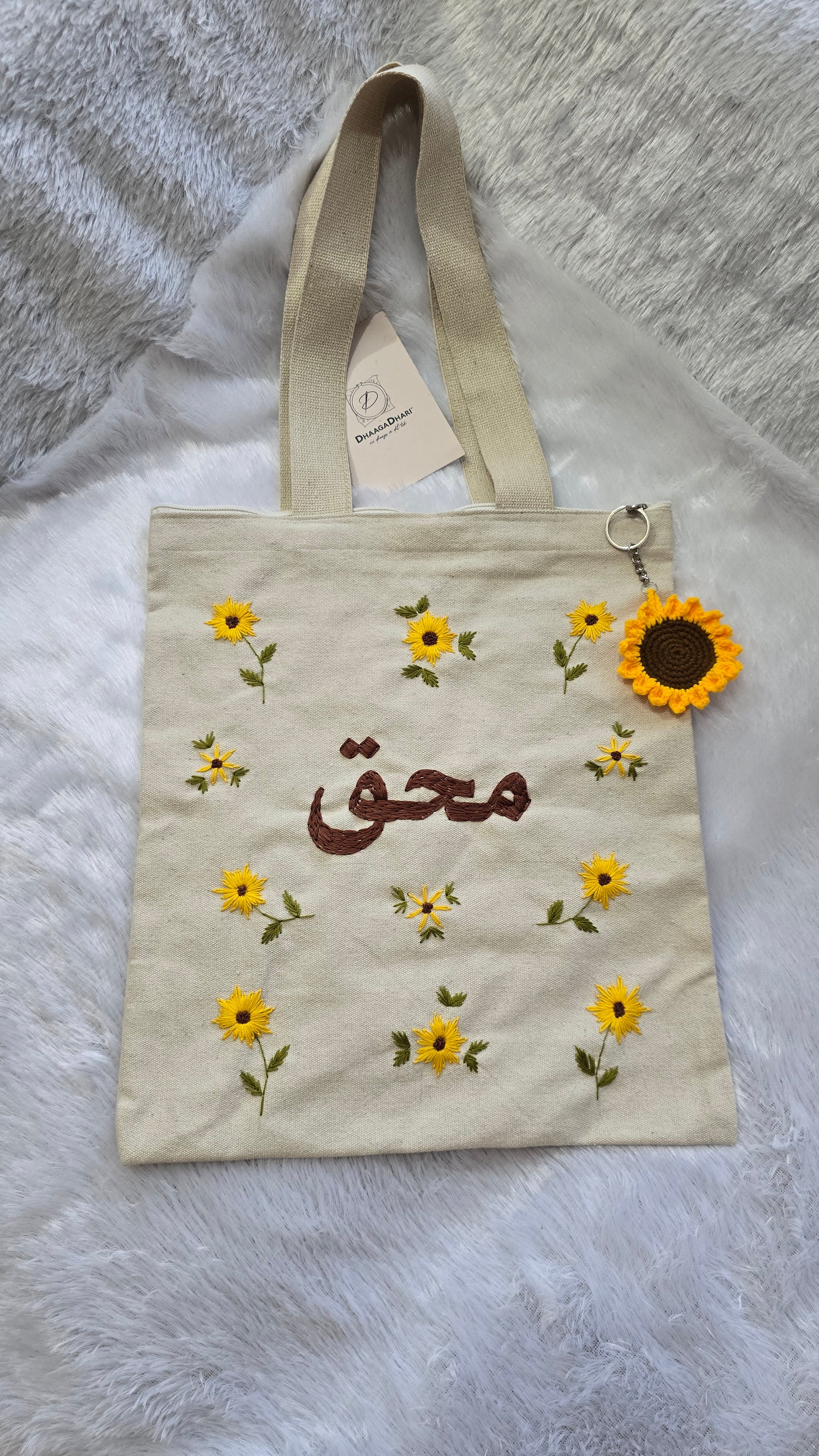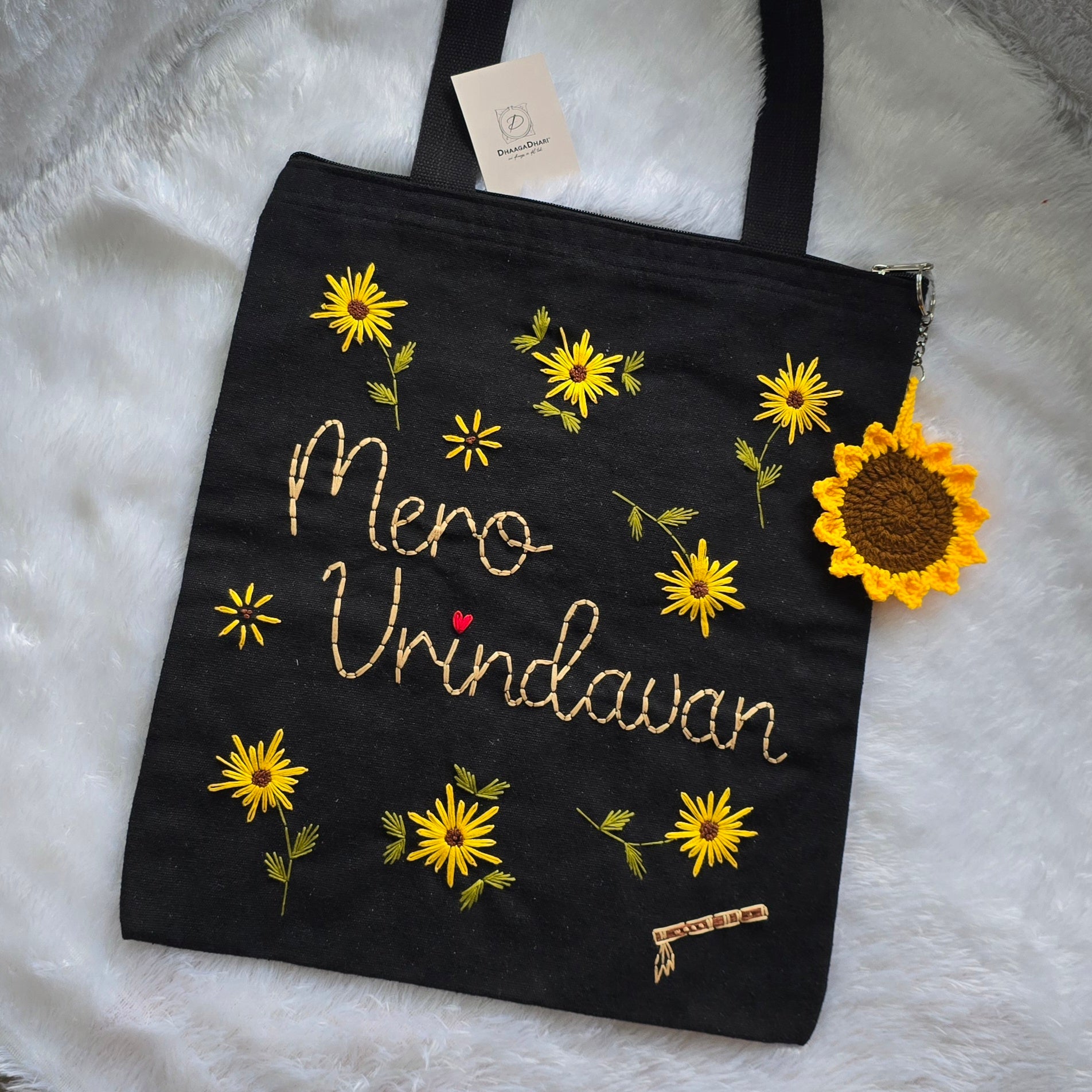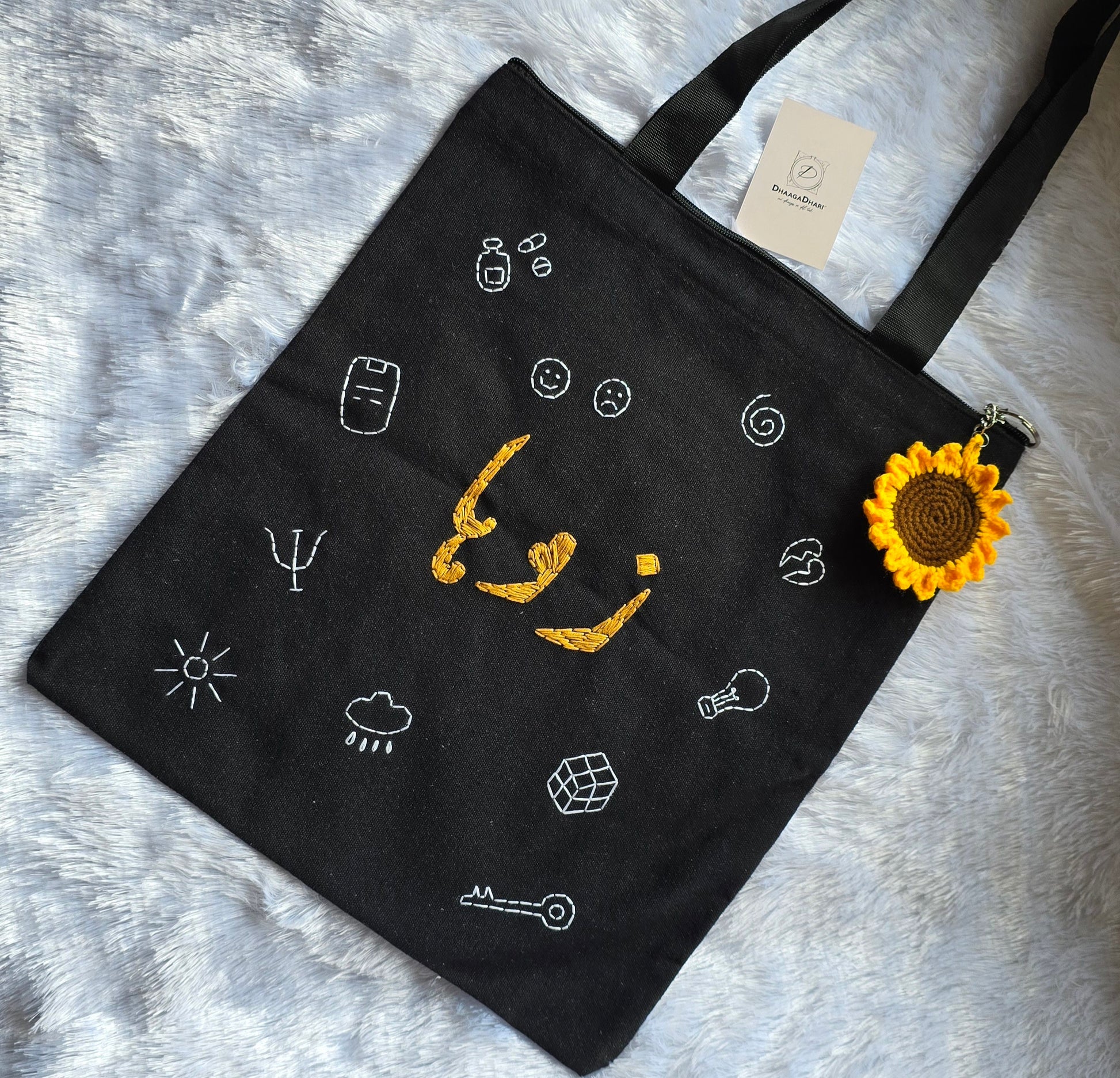 Customized Embroidered Tote Bag | Black & Off-White color with zip | Sunflower | Sunflower Charm