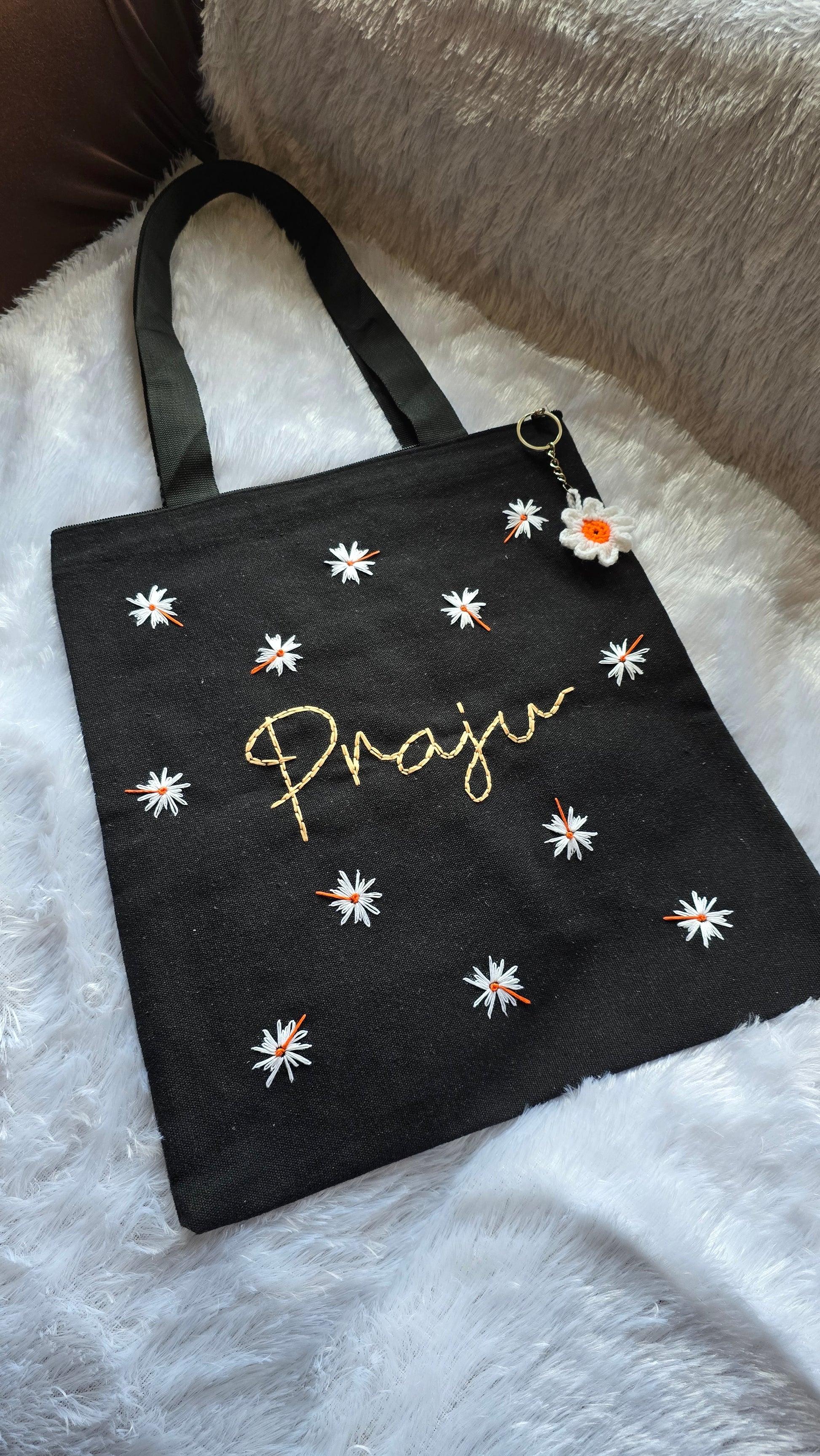 Our black tote bag blooms with charm ✨ and lets you add your own magic—customize with your name, initials, or favorite word 🌼🖤