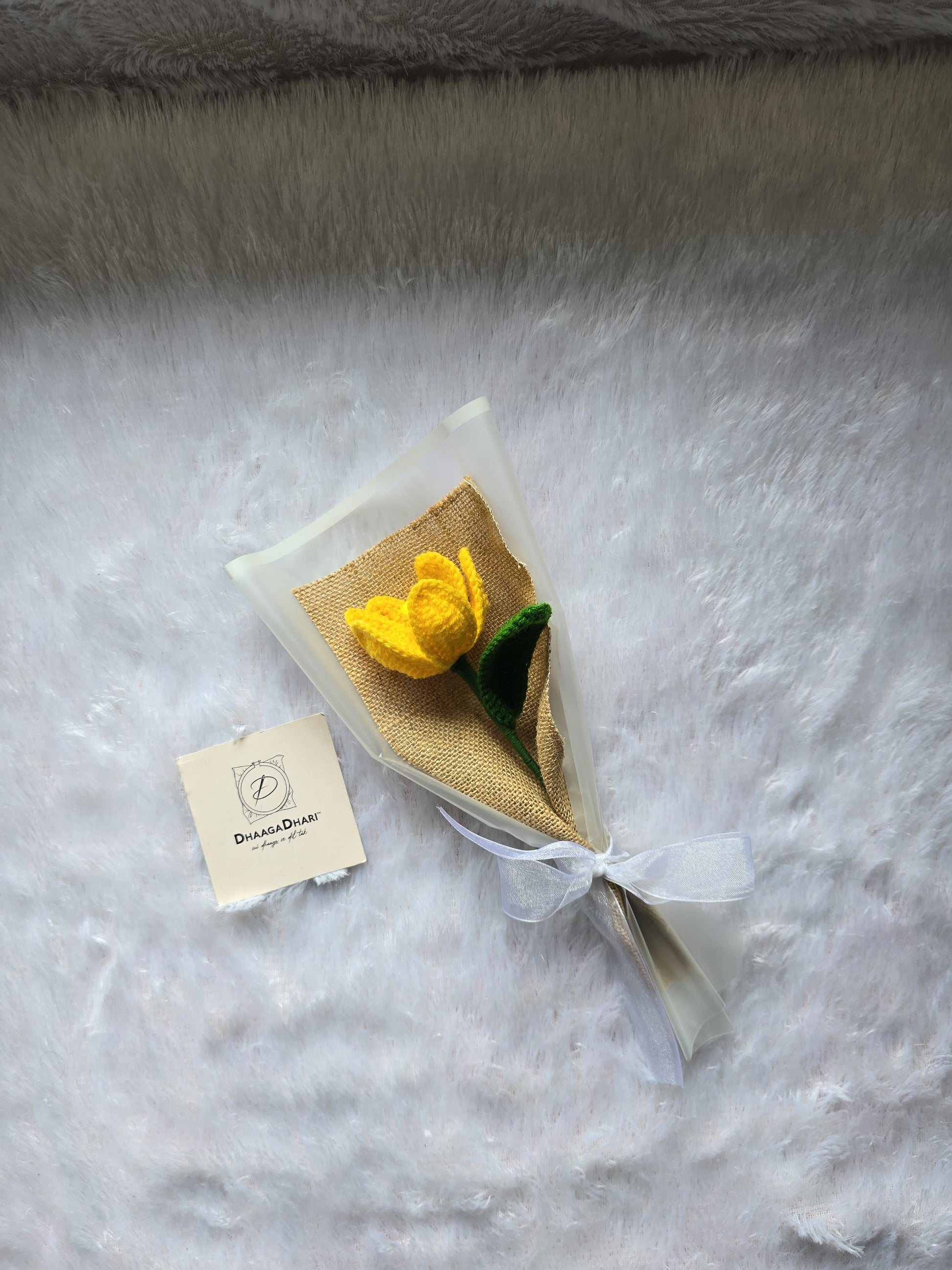 Bring home a flower that never fades. Our hand-crocheted tulips are crafted with love and precision, making them the perfect "forever" gift for someone special. Wrapped in rustic burlap and elegant frosted paper, this single-stem bouquet combines traditional craftsmanship with a modern aesthetic.