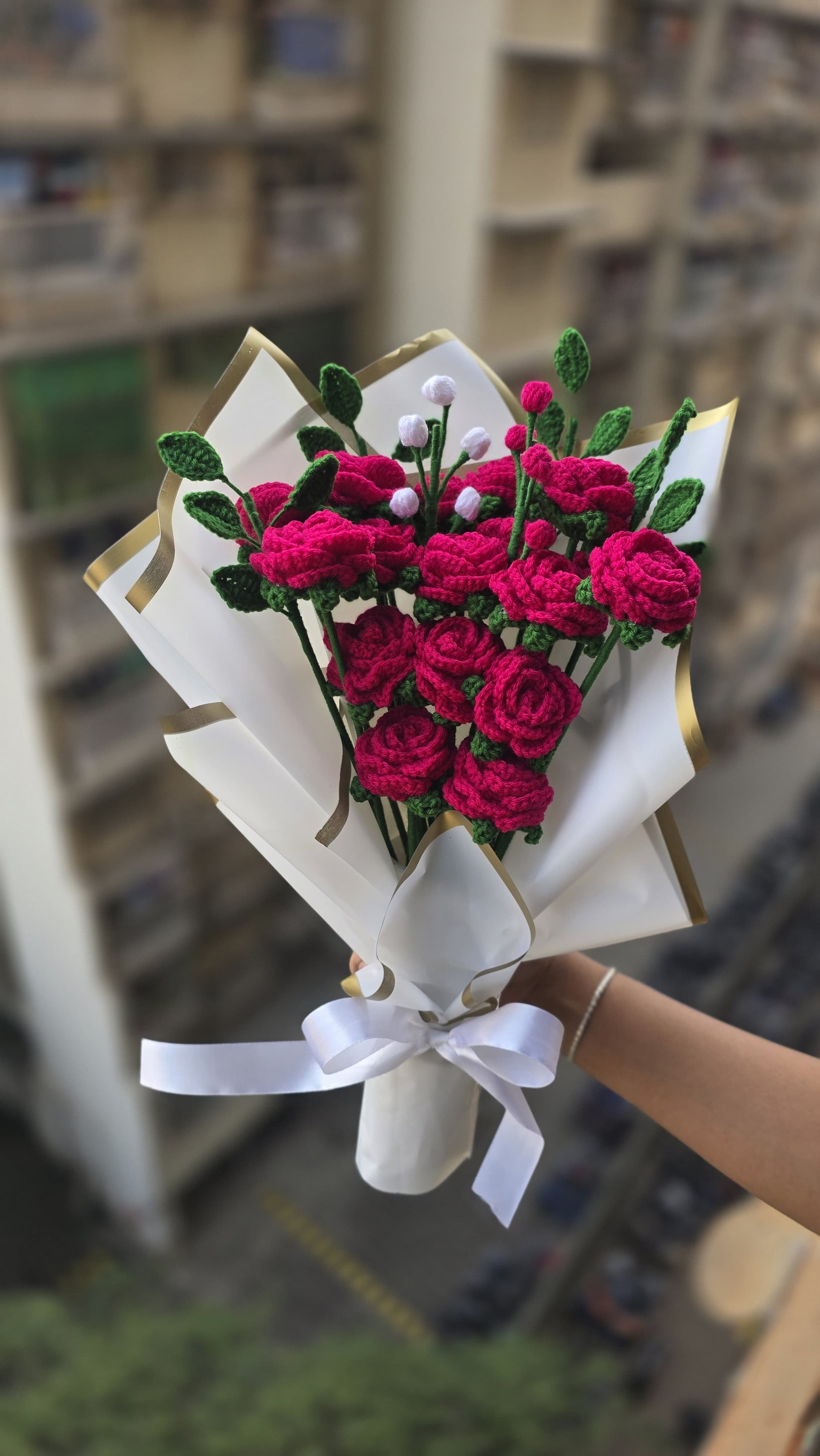Gift a love that never fades. This exquisite, 100% handmade crochet bouquet features 16 intricately detailed roses in a stunning magenta hue. Standing 15 inches tall, it is beautifully wrapped in premium white and gold florist paper, finished with a classic satin bow. Perfect for anniversaries, birthdays, or "just because" moments.