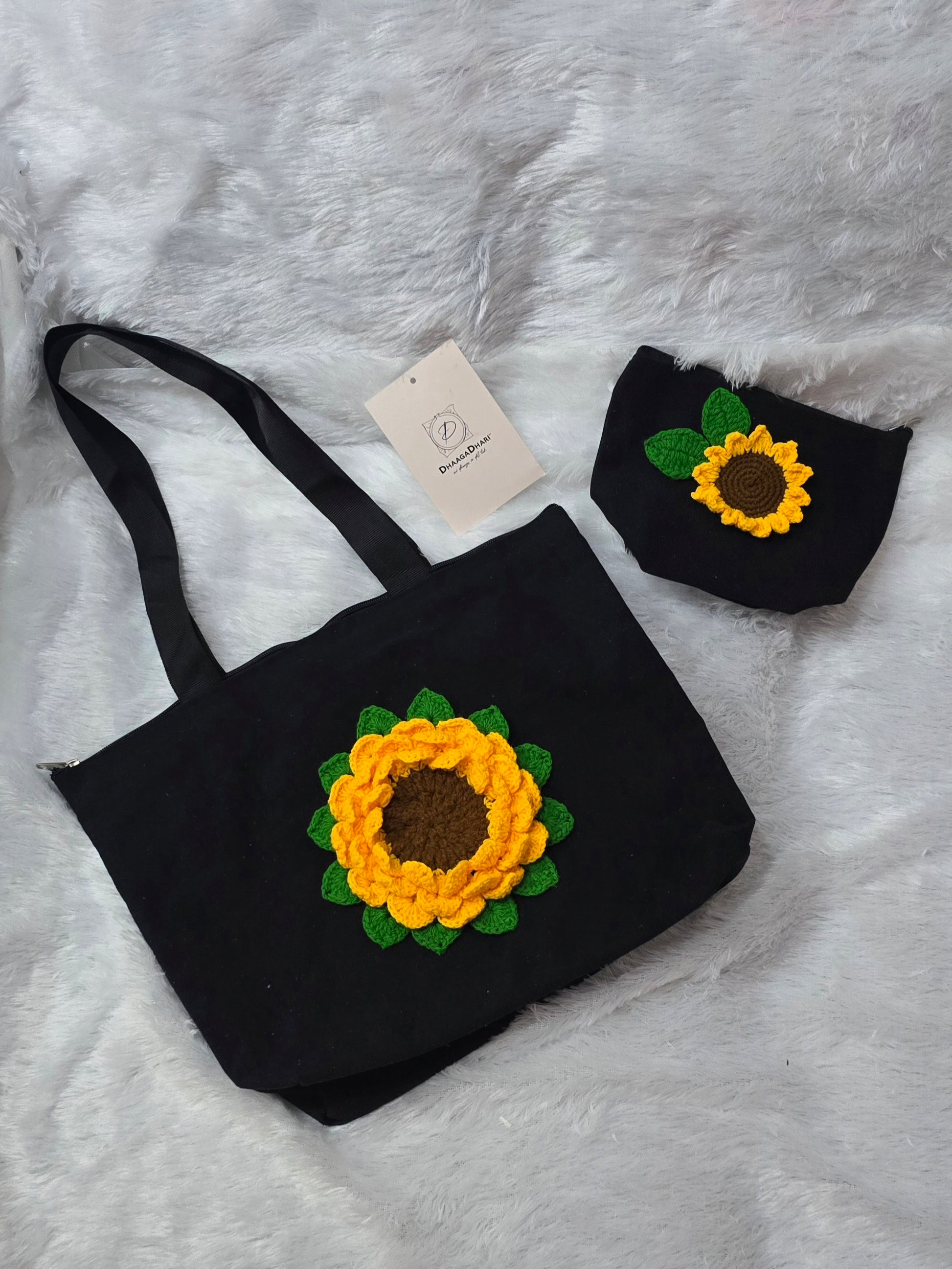 Featuring a hand-crocheted sunflower paired with a matching mini pouch — it’s the perfect duo to brighten your everyday style.