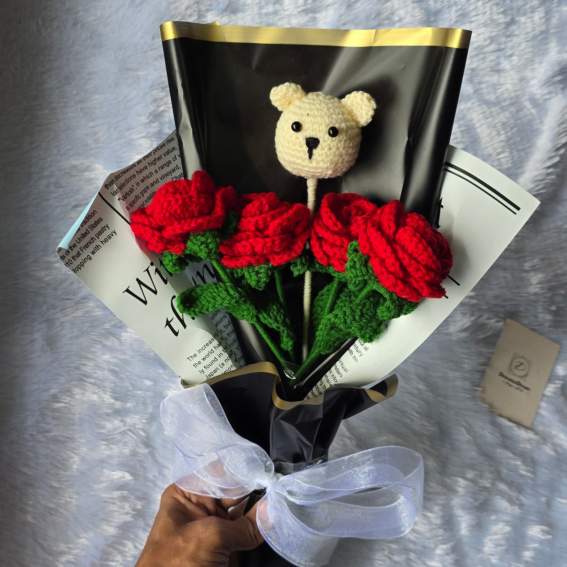 Teddy & Roses Crochet Bouquet – 4 Red Roses with Teddy Face